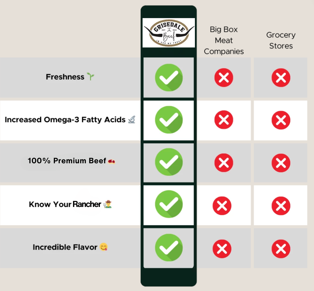 Across the board, beef is filled with essential vitamins and nutrients that are required for optimal health, as well as healthy fat and protein to help you feel your best. While we believe that beef is always a good option, we also believe that buying direct from a producer will get you a more natural, more economical and overall better product. The difference between grass and grain finished is mainly fat and flavor. Grain-finished beef typically contains more fat and is more flavorful, while grass-finished is leaner and usually has a very distinct flavor that some people don't prefer. As a family, we prefer a more conventional, grain-finished flavor profile, which is why we produce beef the way we do!